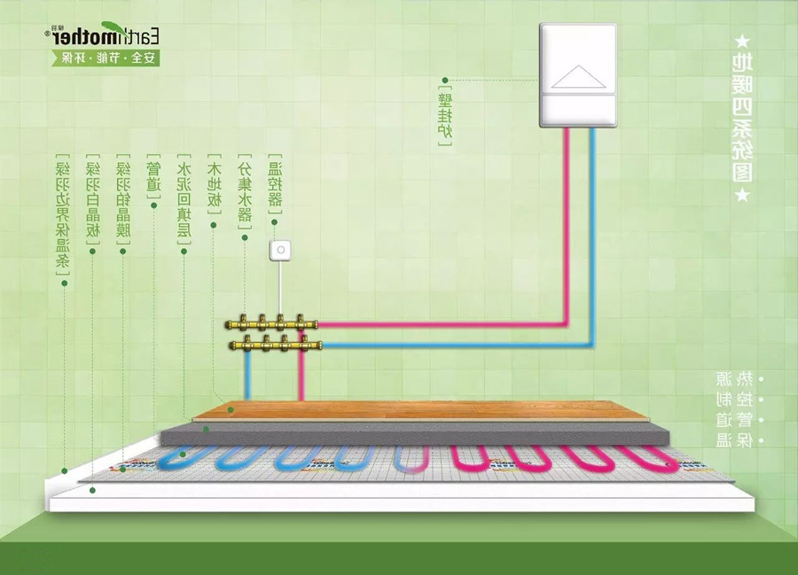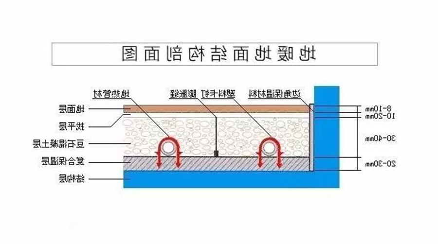 *地暖保温。地暖的保温材料主要有保温板、反射膜、边界保温条、保温套管。其中作用最大的是保温板。现在地暖施工中使用的保温板通常是挤塑板。发热水管上下都是混凝土,在没有保温层的情况下,向上和向下散热量是一样多的,所以选用导热系数越低的挤塑板越好。