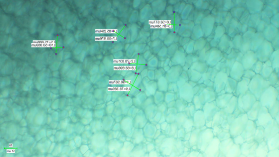 我们还可以借助显微镜观察不同保温板的泡孔结构,通过直接观察泡孔结构的大小判断其抗压性能的好坏。如下图1-4,我们可以看出,产品1(白晶板)无论是正面孔径还是侧面孔径,大小都远低于产品2(大白板)。由此可以判断,白晶板的抗压性能优于大白板。