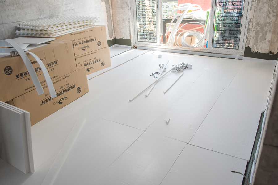 白晶板作为底层保温板,可同时满足保温和抗压需求。再在上层铺设CN300围棋板,盘管时无需使用卡钉,保护保温层结构。同时,二者的叠加可使保温效果更好。