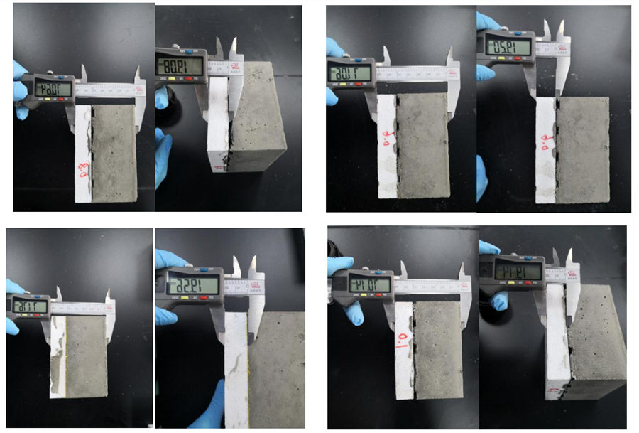 如图 5所示,用数显游标卡尺测量四组试块总厚度及 EPS底板厚度,根据测试结果,总厚度均在 70mm±2mm范围内,底板厚度在 19mm±0.5mm范围内。以上表明:EU-0/CN-1/CN-2/CN-3四组试块按 50mm厚混凝土回填,在回填至养护期结束过程中,底板均未发生凹陷下沉现象。