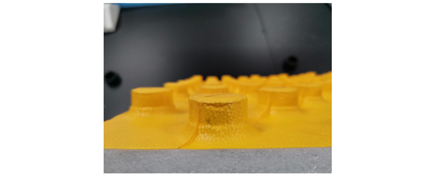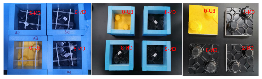 试验取4组试块,EPS底板型号为400R,HIPS膜取常规品0.2mm的黄色EU配套膜,以及0.6mm/0.8mm/1.0mm的CN吸塑膜,分别经热覆膜、吸塑,组合成 EU/CN极系列围棋板。
