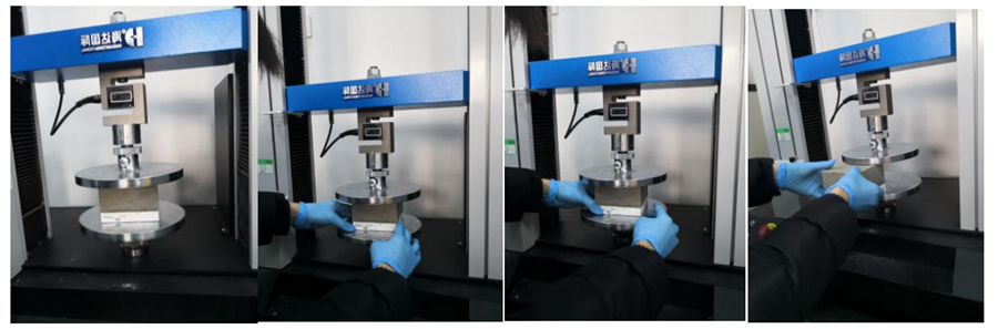 将成品试块放置于多功能拉力机夹具中间,调整测试参数,以试块总厚度的10%为压缩速率,即 7mm/min,匀速压缩试块,至压缩总厚 10%(7mm)停止压缩。