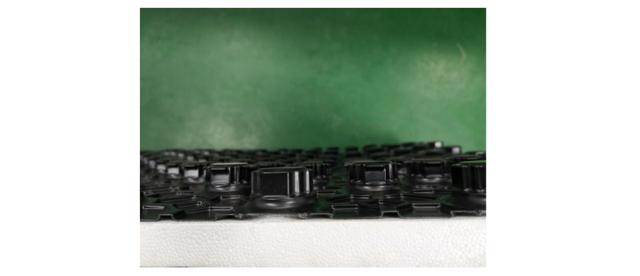 (1)EU-0为热覆膜,为一体式,与 EPS底板接触效果极好,混凝土浇筑后,整体无缝隙,蘑菇头的轴向 HIPS膜在一定程度上增强了承压效果;CN系列中,由于 HIPS膜与 EPS板是吸塑辊压成型,为分体式,HIPS膜与 EPS板间有间隙,同时吸塑系列 HIPS膜结构本身会有一定的厚度高低差,如图 12、13所示;