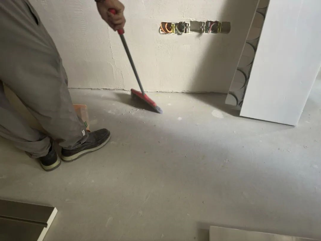 处理方案:管道铺设时平顺下来,后期使用厚贴干拌灰完全盖住管道。全屋采用干湿混铺工艺,次卧直接铺设木地板,客厅厚贴瓷砖,以保证后期地面装饰层的平整性。