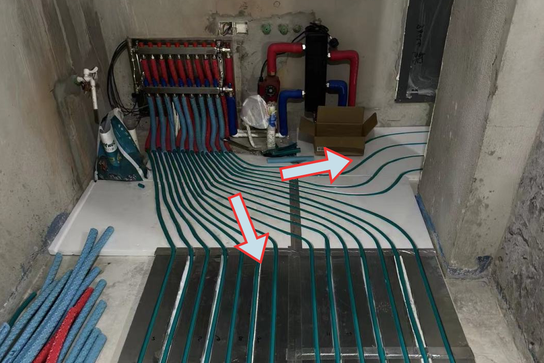 施工难点2:靠近分集水器一侧的空地需要装橱柜,下方不能走管,而分集水器处管路集中,需要重新规划盘管路线,并配备多槽板。